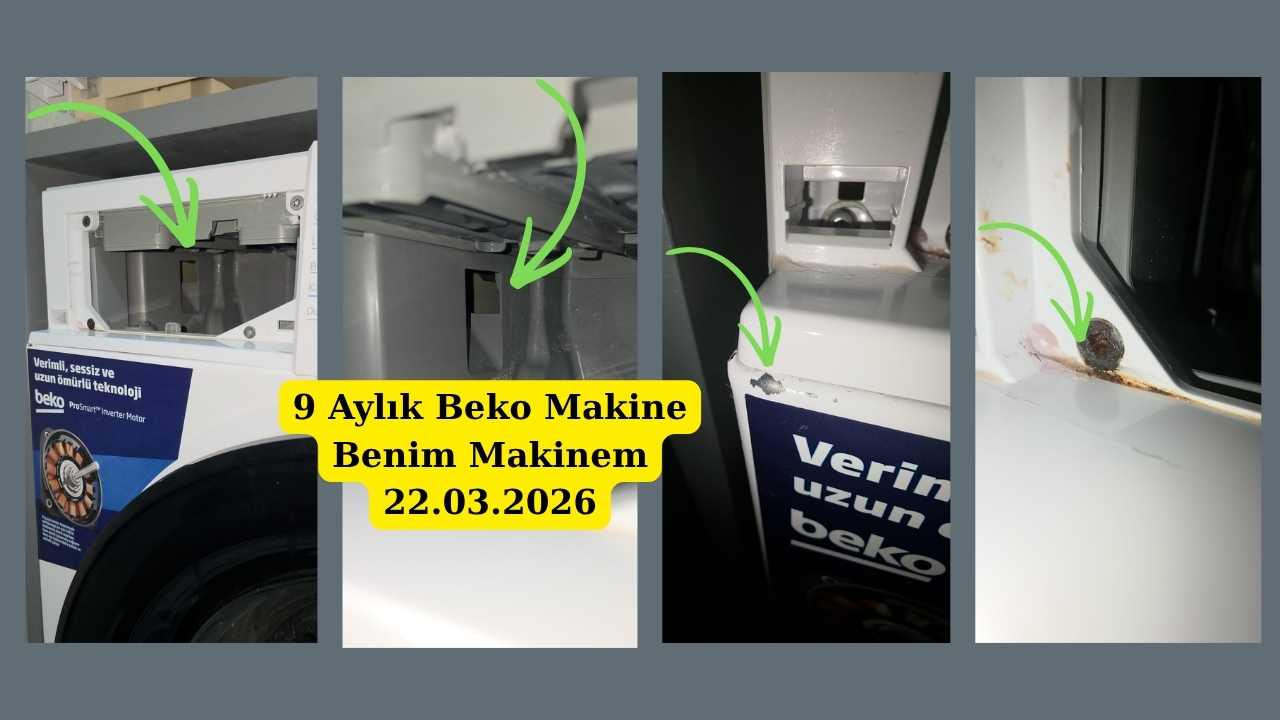 - Aşağıda görülen makine, benim evimdeki 9 aylık makine, ben bu deformasyonları 3 ay önce gördüm yani daha 6 aylıkken bile makineler fire vermeye başlıyor, bunların paslanmaya dönme ve dönüşü olmayan şekle girme süreci 1-2 seneyi buluyor. 3 üncü küçük görseldeki yer deterjan çekmece kapağının hemen alt tarafı, tasarım hatası ile kendi deterjan çekmecesinden dolayı boya atığı oluştuğu çok belli, yine iç noktada göreceğiniz o havadanlık bölümü gibi duşlamalardan dışarı taşan sular da firmalar tarafından sürekli ”KULLANICI HATASI” olarak değerlendiriliyor. Burada kullanıcının nasıl bir hatası olabilir mesela?