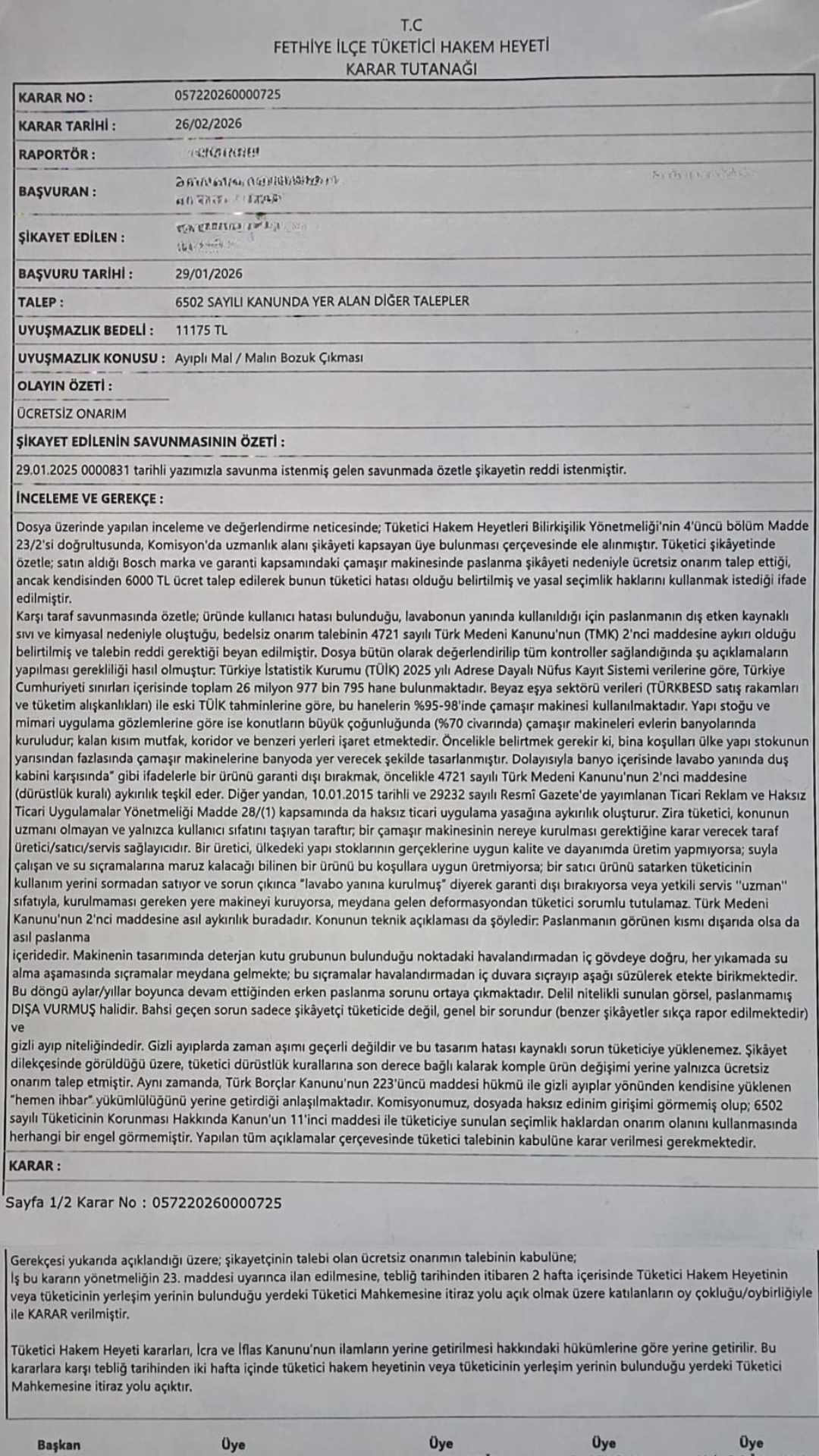 Size paylaştığım 0572202600000725 sayılı Fethiye İlçe Tüketici Hakem Heyeti kararı, bu tür şikayetler için bir rehber niteliğindedir. Heyet, incelemesinde şu can alıcı tespitleri yapmıştır:
