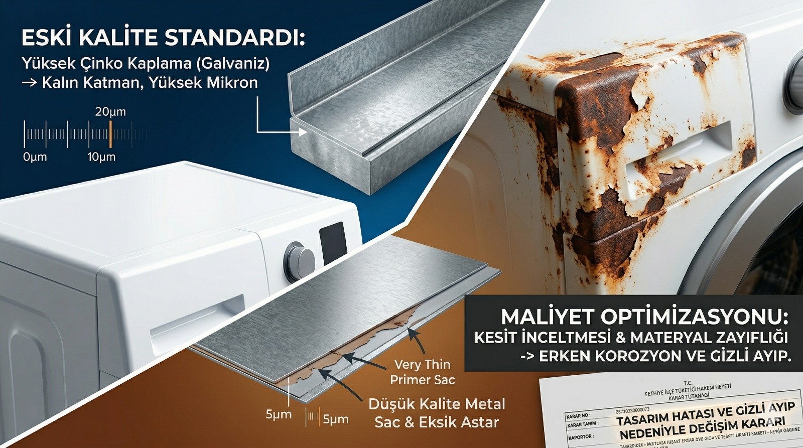 Bir beyaz eşyanın korozyon direncini ve ömrünü belirleyen en önemli faktör, dış sacın kalitesi ve yüzey işlemidir. Günümüzde “maliyet optimizasyonu” adı altında üretim süreçlerinde ciddi kalite düşüşleri, kesit inceltmeleri ve kullanılan materyallerin zayıflığının olumsuz yan etkileri yaşanıyor.