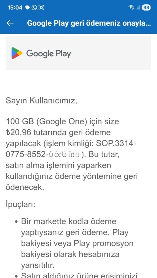 - İade Onayı: Kısa süre içinde “Google Play geri ödemeniz onaylandı” başlıklı bir e-posta alırsınız.