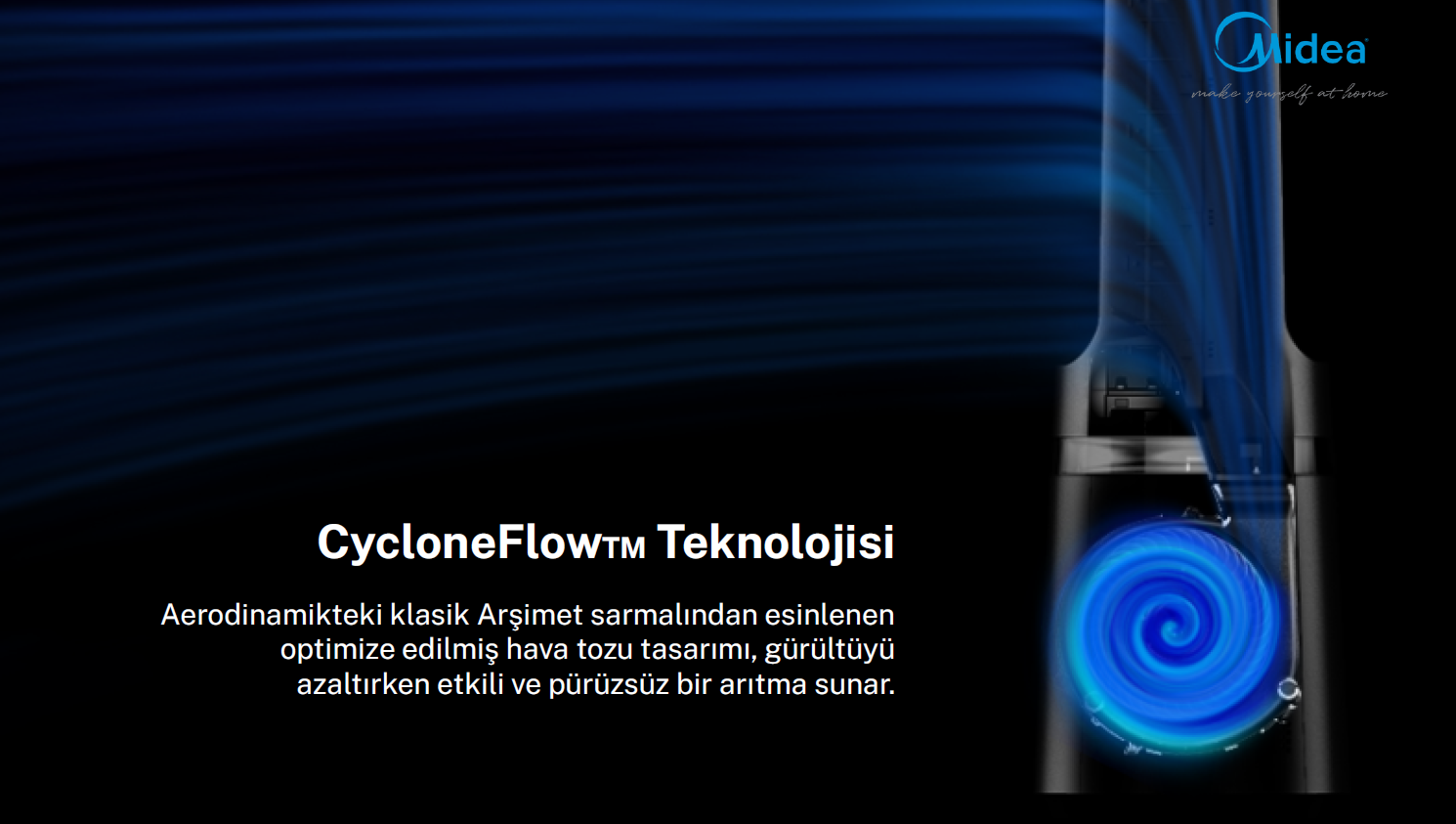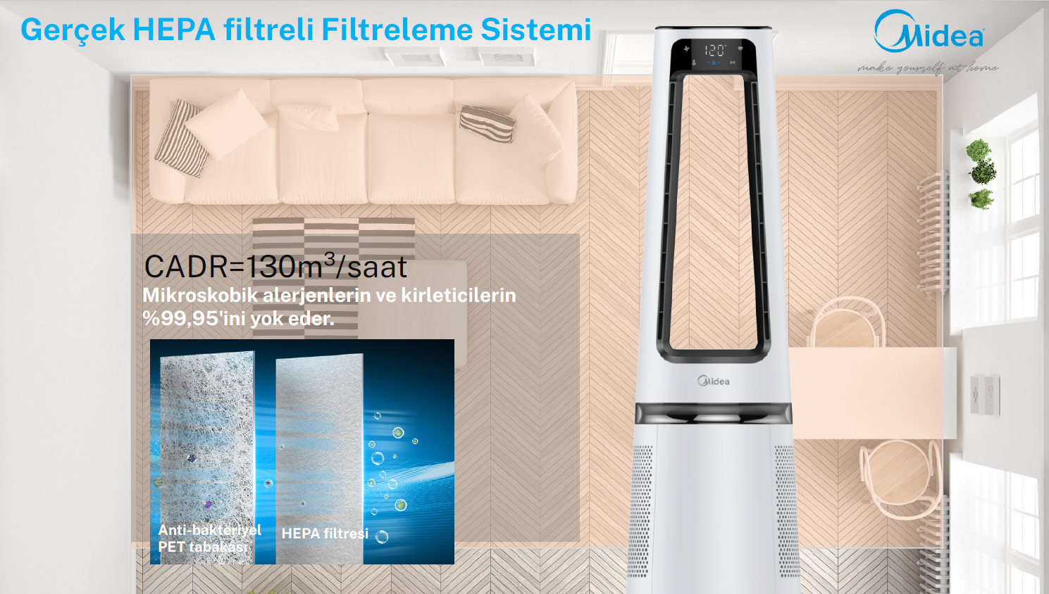 Modern hava temizleme ve serinletme cihazlarında H13 HEPA filtreler, akıllı teknolojilerle birleşince çok daha güçlü hale geliyor. Örneğin, Midea Eiffel Hava Temizleme cihazı CycloneFlow teknolojisi, deniz kabuğu şeklindeki hava kanalından ilham alınarak tasarlanmış aerodinamik bir yapı sunar. Bu sistem, yüksek hacimli hava akışı üretirken gürültüyü minimuma indirir ve odanın her köşesine pürüzsüz, etkili bir şekilde temiz hava ulaştırır.