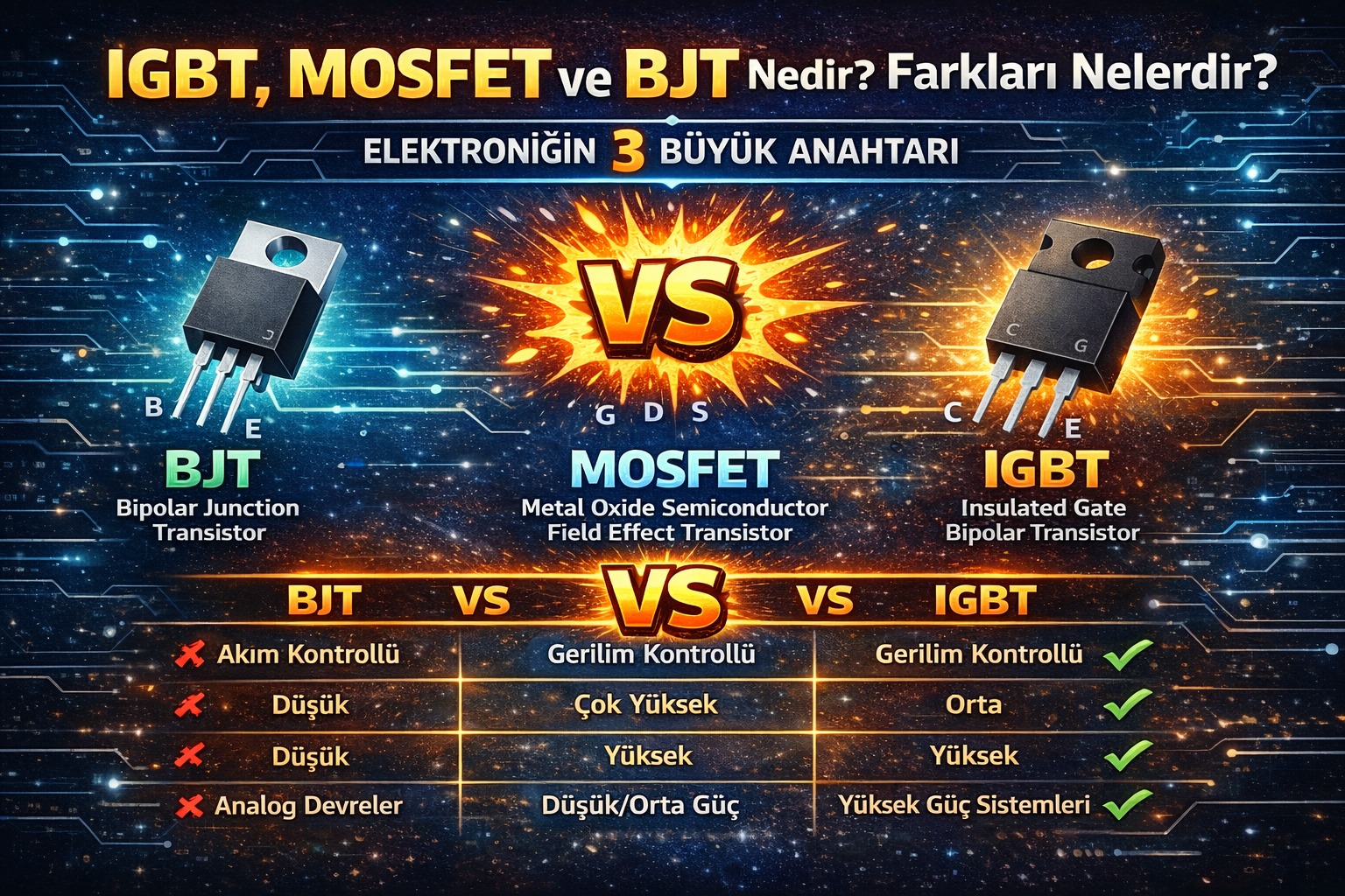 | Özellik | BJT | MOSFET | IGBT |