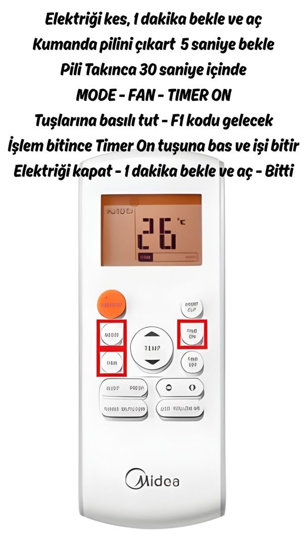 Ön Uyarı! Bazı kumandalar uyumsuzluk gösterebiliyor, bu durumda OK tuşu olan Midea Prime kumandası ile kodlama yapılabiliyor