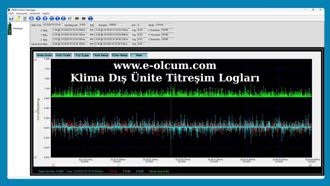 Testin bir bölümünde dış ünite vibrasyon seviye kontrollerini de yaptım ve bu kontroller esnasında datalogger sponsorum olan www.e-olcum.com Sina Bey ve ekibi sayesinde çok ciddi arşiv kayıtları da elde etme şansı buldum. Bugüne kadar ülkemizde hiçbir test esnasında bir klimanın vibrasyon testi yapılmamıştır, bu konuda ülkede bir İLK olmamın mutluluğunu da sizlerle paylaşmak isterim