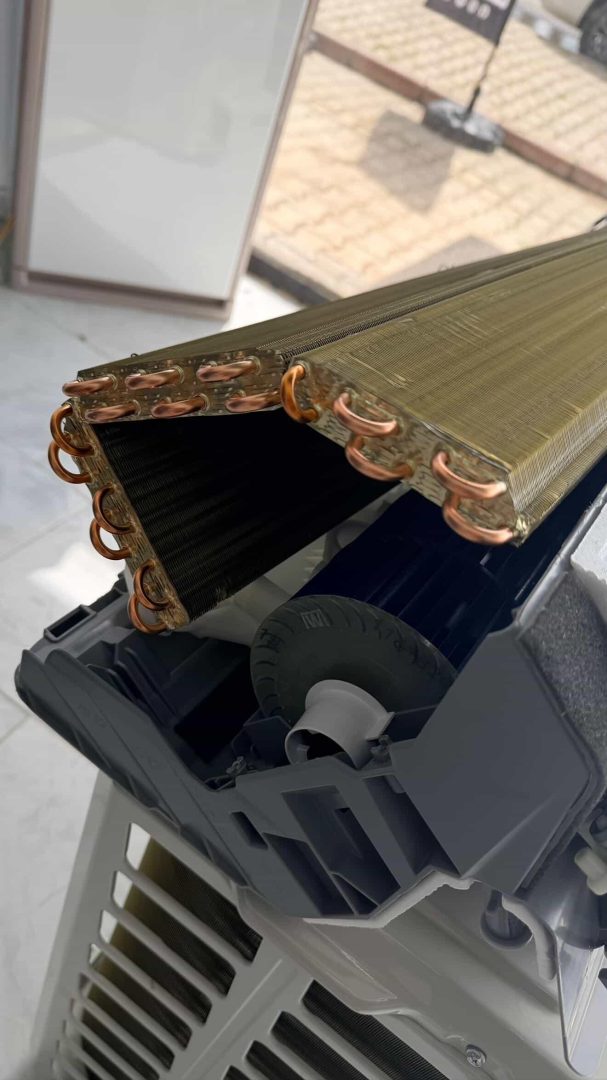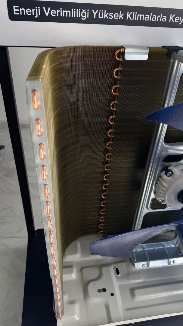 İşte burada işler biraz ilginçleşiyor. 24.000 BTU’luk bir canavarı beslemek için beklediğimiz o devasa çift sıra kondenser yerine, 1.5 katmanlı (34 sıra) bir yapı ile karşılaşıyoruz.
