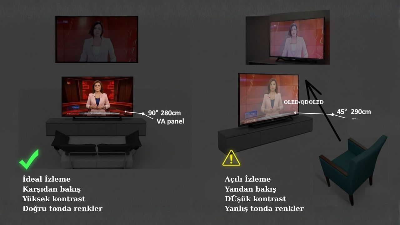 - Oturma Düzenine Bakın: Tekli koltukta hep karşıdan mı izleyeceksiniz? (VA/PSVA seçin). Koltuklar odaya yayılmış mı? (IPS/ADS seçin).